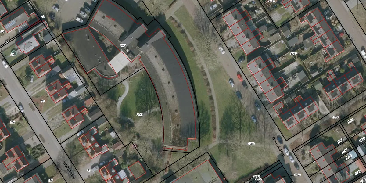Het perceel waarop Bouwkamp 10-4 staat heeft een oppervlakte van 2785 m². Dit is een zeer groot perceel. De perceeloppervlakte wordt geregistreerd door het Kadaster. Gedetailleerde informatie over de maten van dit perceel kunt u vinden in het rapport Kadastrale kaart met maatvoering van Bouwkamp 10-4.