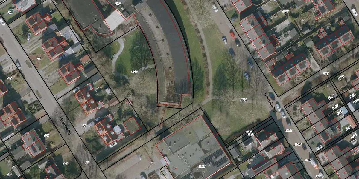 Het perceel waarop Bouwkamp 10-7 staat heeft een oppervlakte van 2785 m². Dit is een zeer groot perceel. De perceeloppervlakte wordt geregistreerd door het Kadaster. Gedetailleerde informatie over de maten van dit perceel kunt u vinden in het rapport Kadastrale kaart met maatvoering van Bouwkamp 10-7.