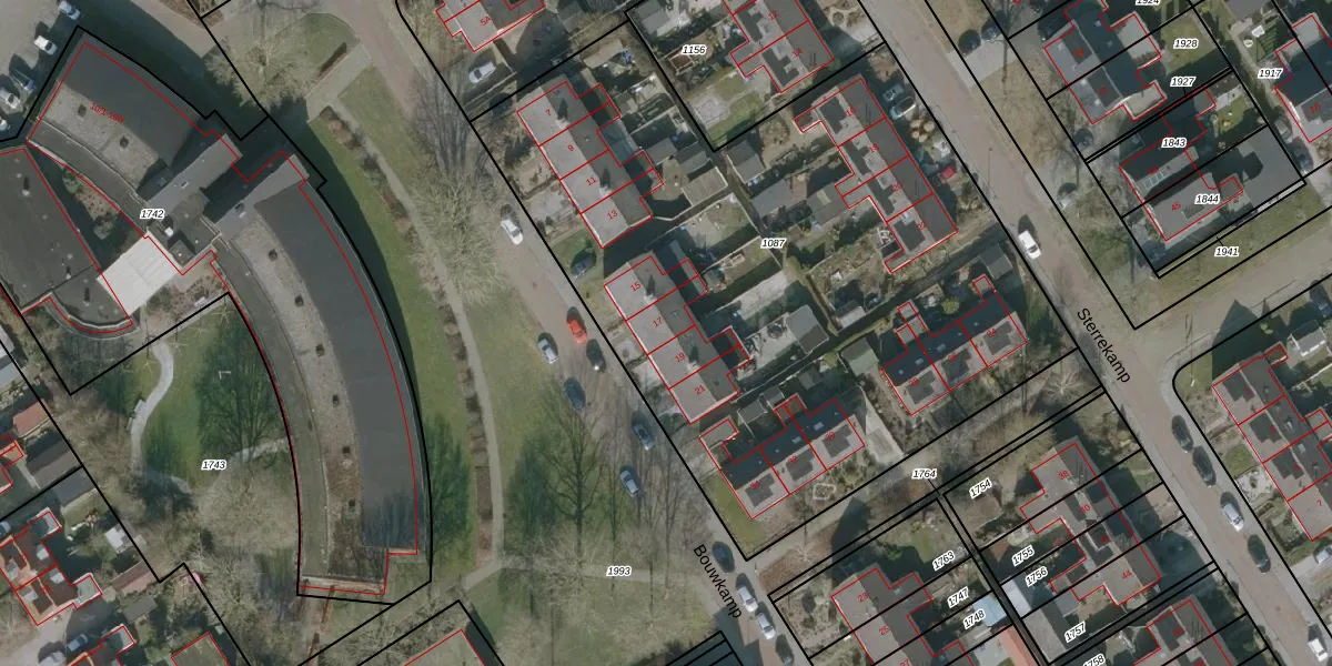 Het perceel waarop Bouwkamp 17 staat heeft een oppervlakte van 3874 m². Dit is een zeer groot perceel. De perceeloppervlakte wordt geregistreerd door het Kadaster. Gedetailleerde informatie over de maten van dit perceel kunt u vinden in het rapport Kadastrale kaart met maatvoering van Bouwkamp 17.