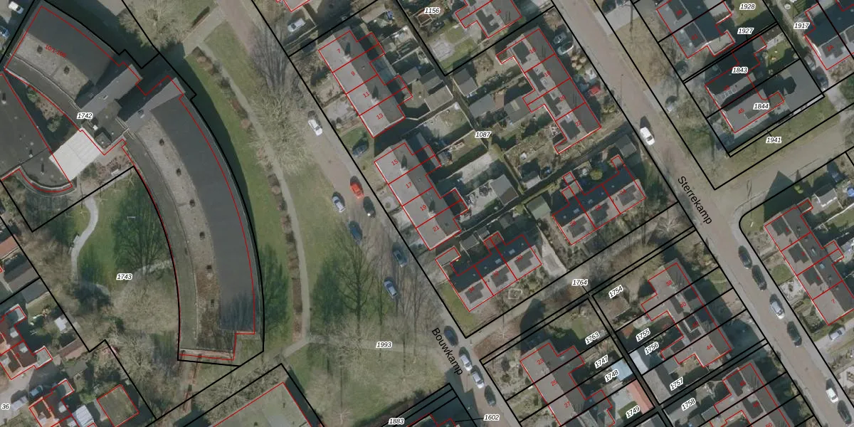 Het perceel waarop Bouwkamp 19 staat heeft een oppervlakte van 3874 m². Dit is een zeer groot perceel. De perceeloppervlakte wordt geregistreerd door het Kadaster. Gedetailleerde informatie over de maten van dit perceel kunt u vinden in het rapport Kadastrale kaart met maatvoering van Bouwkamp 19.