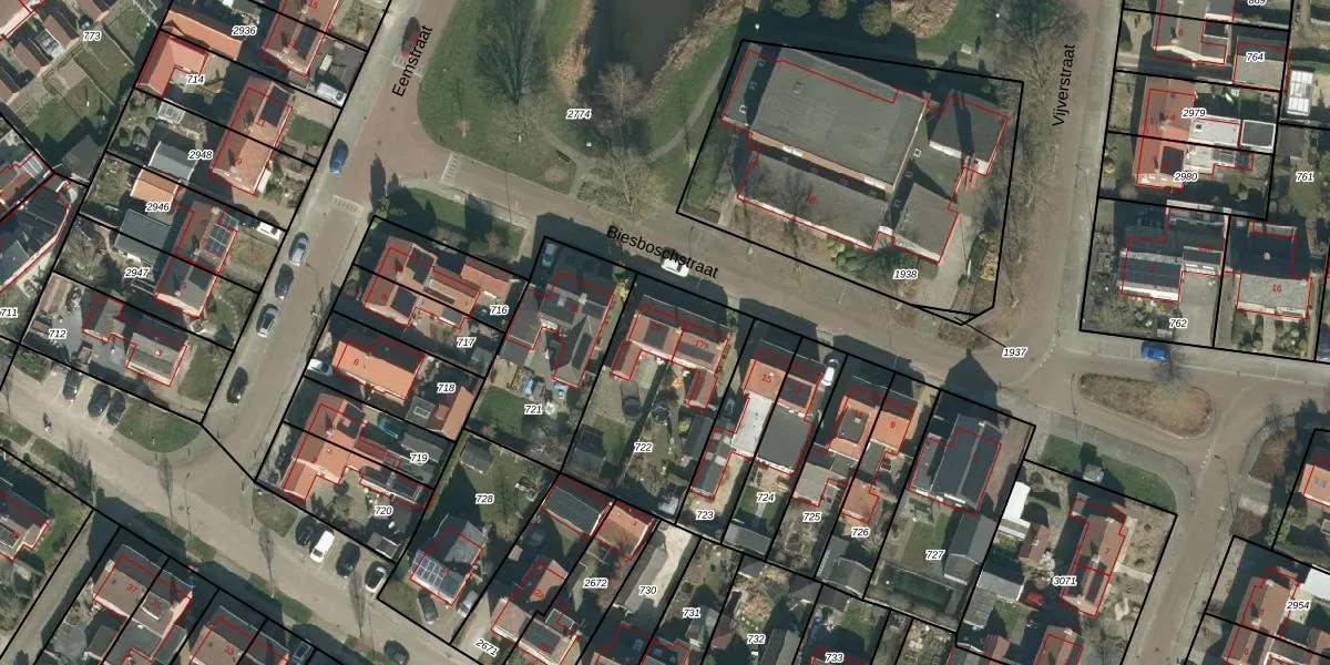 Het perceel waarop Biesboschstraat 19 staat heeft een oppervlakte van 615 m². Dit is een groot perceel. De perceeloppervlakte wordt geregistreerd door het Kadaster. Gedetailleerde informatie over de maten van dit perceel kunt u vinden in het rapport Kadastrale kaart met maatvoering van Biesboschstraat 19.