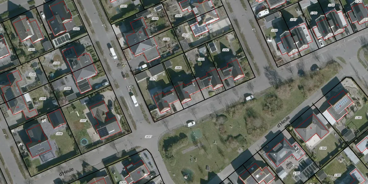 Het perceel waarop d'Heule 14 staat heeft een oppervlakte van 350 m². Dit is een groot perceel. De perceeloppervlakte wordt geregistreerd door het Kadaster. Gedetailleerde informatie over de maten van dit perceel kunt u vinden in het rapport Kadastrale kaart met maatvoering van d'Heule 14.