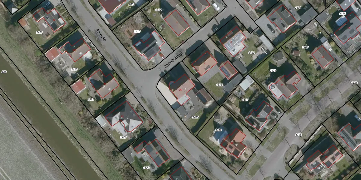 Het perceel waarop d'Heule 35 staat heeft een oppervlakte van 734 m². Dit is een groot perceel. De perceeloppervlakte wordt geregistreerd door het Kadaster. Gedetailleerde informatie over de maten van dit perceel kunt u vinden in het rapport Kadastrale kaart met maatvoering van d'Heule 35.