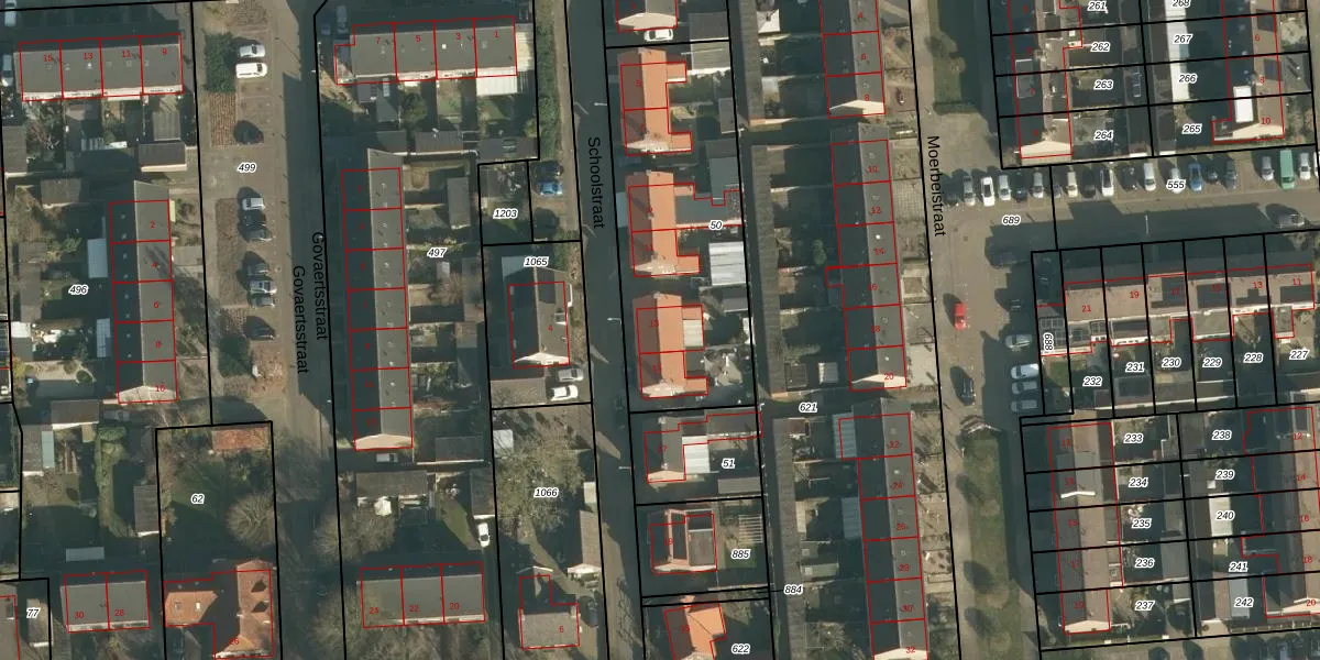 Schoolstraat 13 is gelegen op kadastraal perceel VMN00M50. Deze kadastrale aanduiding is uniek en wordt gebruikt door het Kadaster om eigendomsrechten en andere zakelijke rechten vast te leggen. Het perceel maakt onderdeel uit van de kadastrale gemeente Vlijmen.