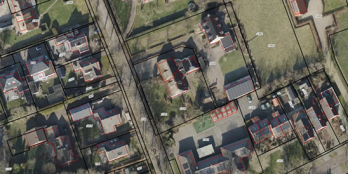 Ds.Smitslaan 2 is gelegen op kadastraal perceel NLS00M1028. Deze kadastrale aanduiding is uniek en wordt gebruikt door het Kadaster om eigendomsrechten en andere zakelijke rechten vast te leggen. Het perceel maakt onderdeel uit van de kadastrale gemeente Nieuwleusen.