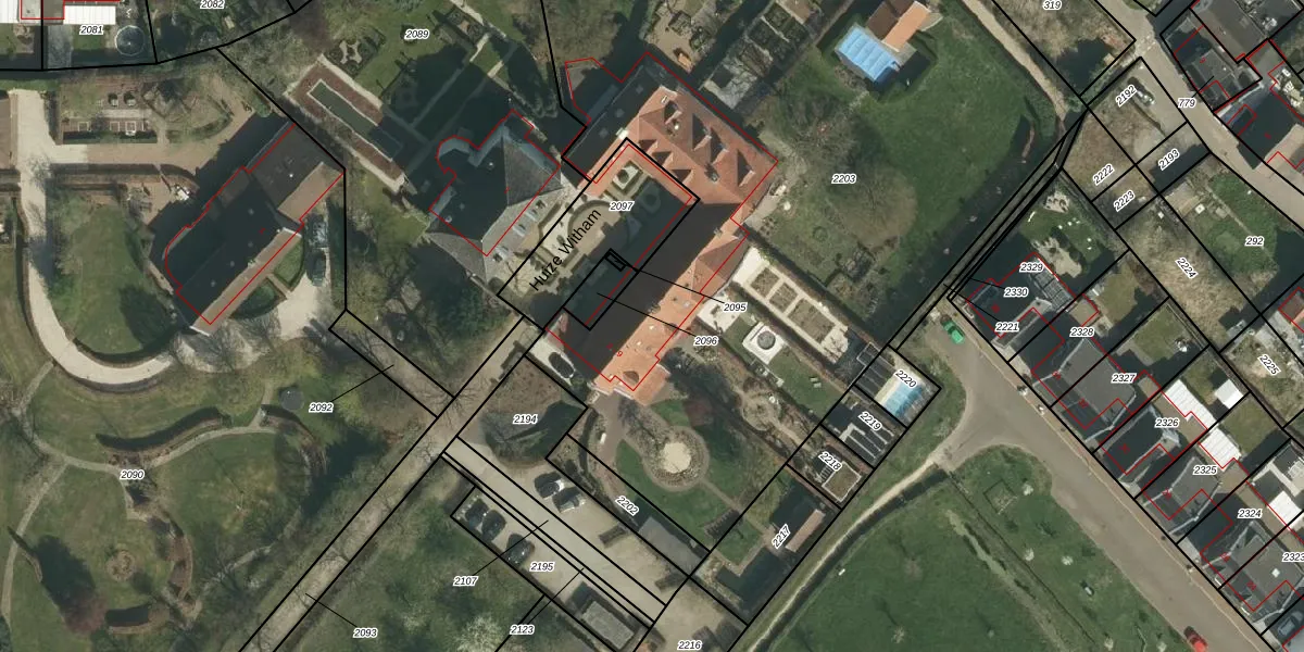 Het perceel waarop Huize Witham 3 staat heeft een oppervlakte van 6350 m². Dit is een zeer groot perceel. De perceeloppervlakte wordt geregistreerd door het Kadaster. Gedetailleerde informatie over de maten van dit perceel kunt u vinden in het rapport Kadastrale kaart met maatvoering van Huize Witham 3.