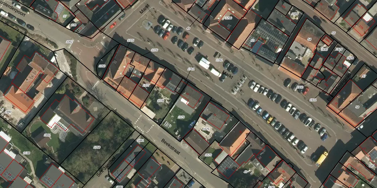 Het perceel waarop Markt 12 staat heeft een oppervlakte van 427 m². Dit is een groot perceel. De perceeloppervlakte wordt geregistreerd door het Kadaster. Gedetailleerde informatie over de maten van dit perceel kunt u vinden in het rapport Kadastrale kaart met maatvoering van Markt 12.