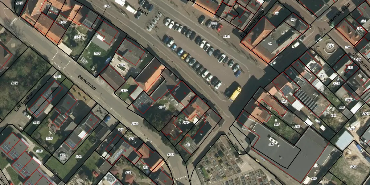 Het perceel waarop Markt 18 staat heeft een oppervlakte van 585 m². Dit is een groot perceel. De perceeloppervlakte wordt geregistreerd door het Kadaster. Gedetailleerde informatie over de maten van dit perceel kunt u vinden in het rapport Kadastrale kaart met maatvoering van Markt 18.