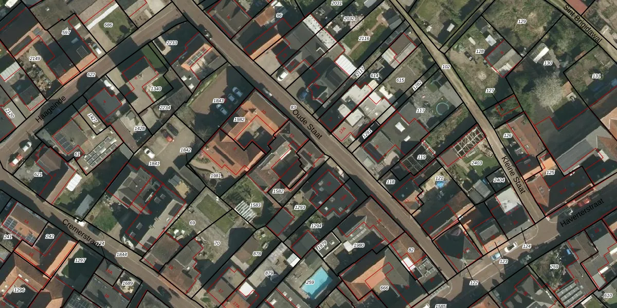 Oude Staat 14 is gelegen op kadastraal perceel NST02E1582. Deze kadastrale aanduiding is uniek en wordt gebruikt door het Kadaster om eigendomsrechten en andere zakelijke rechten vast te leggen. Het perceel maakt onderdeel uit van de kadastrale gemeente Nieuwstadt.