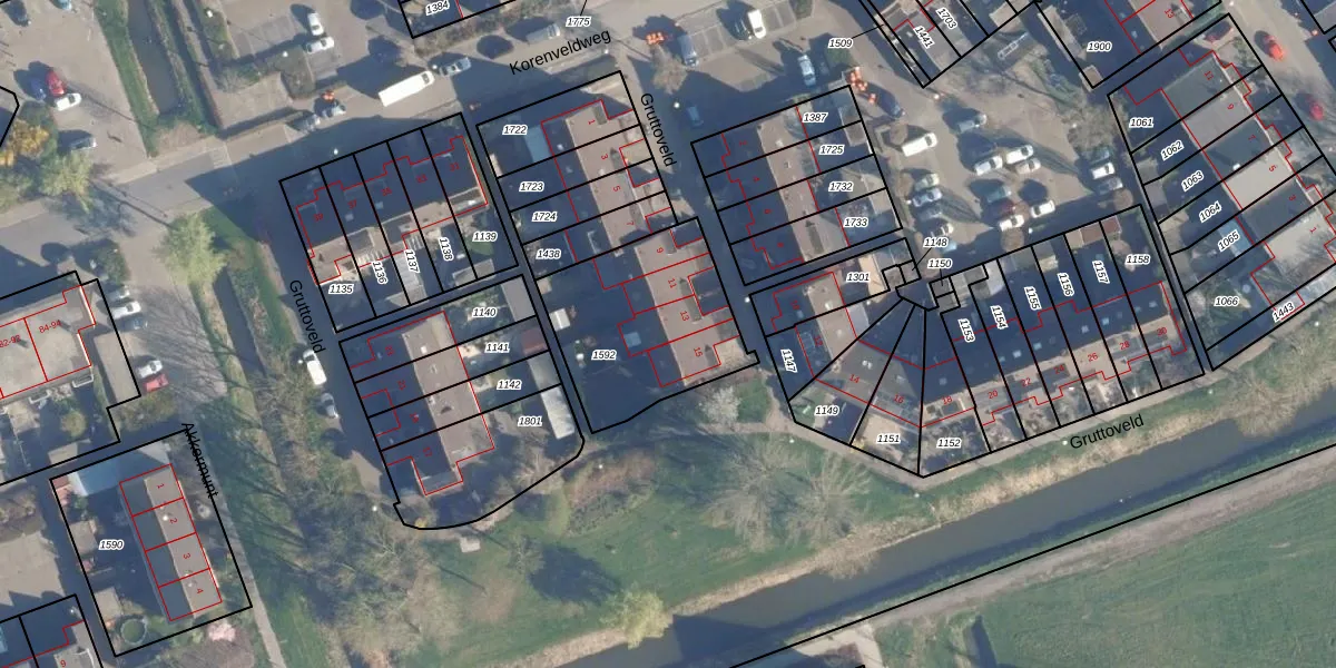 Gruttoveld 13 is gelegen op kadastraal perceel NVN00B1592. Deze kadastrale aanduiding is uniek en wordt gebruikt door het Kadaster om eigendomsrechten en andere zakelijke rechten vast te leggen. Het perceel maakt onderdeel uit van de kadastrale gemeente Nieuwveen.