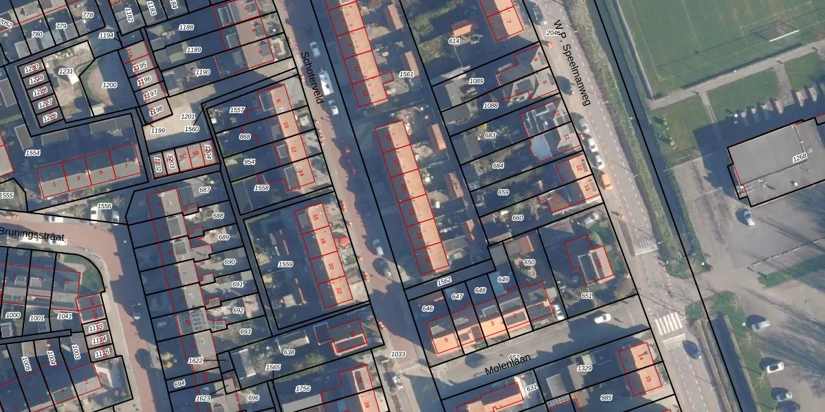 Het perceel waarop Schoterveld 21 staat heeft een oppervlakte van 1827 m². Dit is een zeer groot perceel. De perceeloppervlakte wordt geregistreerd door het Kadaster. Gedetailleerde informatie over de maten van dit perceel kunt u vinden in het rapport Kadastrale kaart met maatvoering van Schoterveld 21.