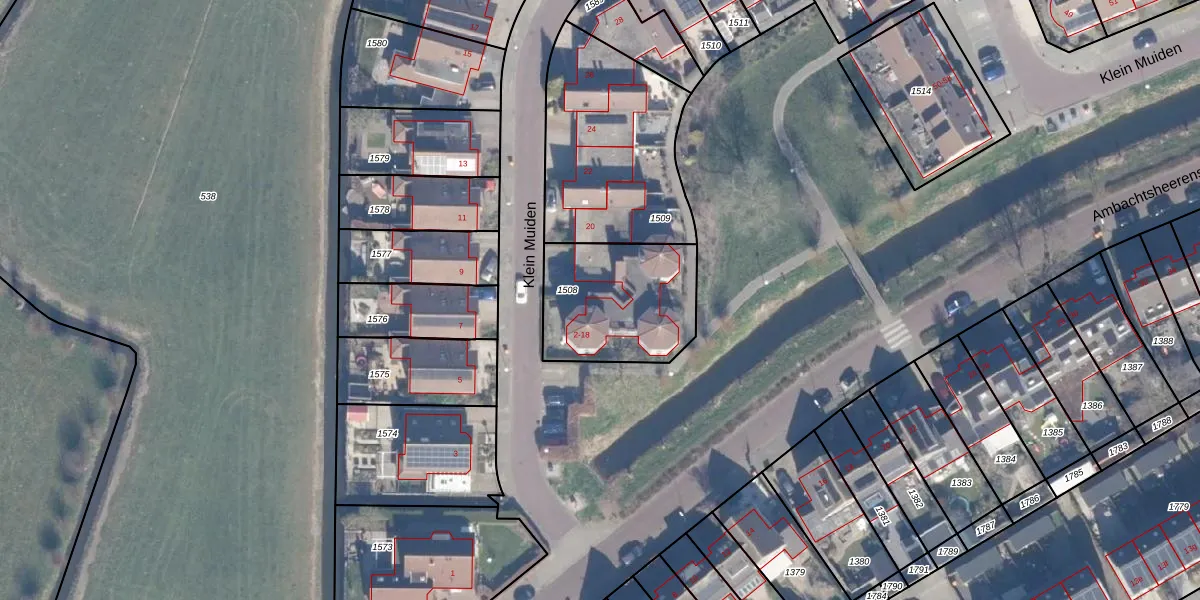 Het perceel waarop Klein Muiden 2 staat heeft een oppervlakte van 493 m². Dit is een groot perceel. De perceeloppervlakte wordt geregistreerd door het Kadaster. Gedetailleerde informatie over de maten van dit perceel kunt u vinden in het rapport Kadastrale kaart met maatvoering van Klein Muiden 2.