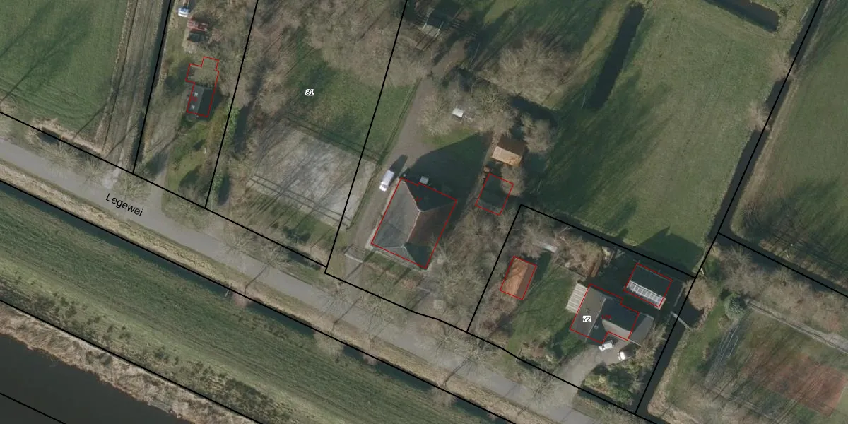 Het perceel waarop Legewei 17 staat heeft een oppervlakte van 3,6 ha. Dit is een zeer groot perceel. De perceeloppervlakte wordt geregistreerd door het Kadaster. Gedetailleerde informatie over de maten van dit perceel kunt u vinden in het rapport Kadastrale kaart met maatvoering van Legewei 17.