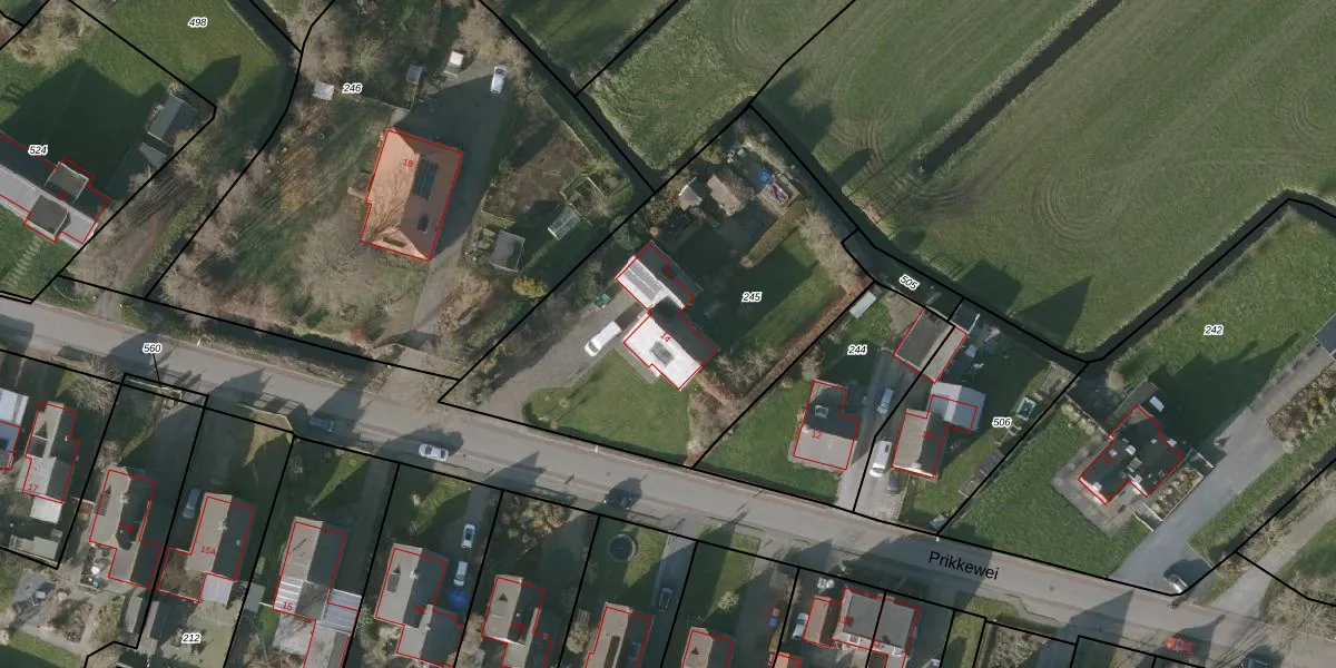 Het perceel waarop Prikkewei 14 staat heeft een oppervlakte van 1735 m². Dit is een zeer groot perceel. De perceeloppervlakte wordt geregistreerd door het Kadaster. Gedetailleerde informatie over de maten van dit perceel kunt u vinden in het rapport Kadastrale kaart met maatvoering van Prikkewei 14.