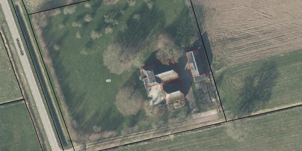 Het perceel waarop Middendijk 18 staat heeft een oppervlakte van 1,0 ha. Dit is een zeer groot perceel. De perceeloppervlakte wordt geregistreerd door het Kadaster. Gedetailleerde informatie over de maten van dit perceel kunt u vinden in het rapport Kadastrale kaart met maatvoering van Middendijk 18.