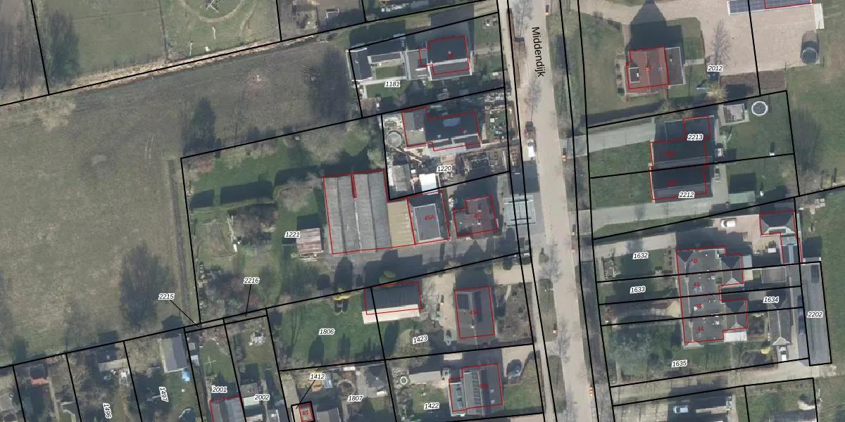 Middendijk 45-A is gelegen op kadastraal perceel NBK02B1221. Deze kadastrale aanduiding is uniek en wordt gebruikt door het Kadaster om eigendomsrechten en andere zakelijke rechten vast te leggen. Het perceel maakt onderdeel uit van de kadastrale gemeente Nijbroek.