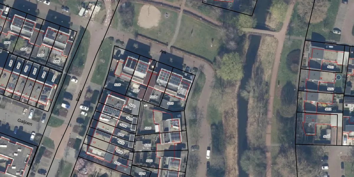 Het perceel waarop Ark 7 staat heeft een oppervlakte van 314 m². Dit is een groot perceel. De perceeloppervlakte wordt geregistreerd door het Kadaster. Gedetailleerde informatie over de maten van dit perceel kunt u vinden in het rapport Kadastrale kaart met maatvoering van Ark 7.