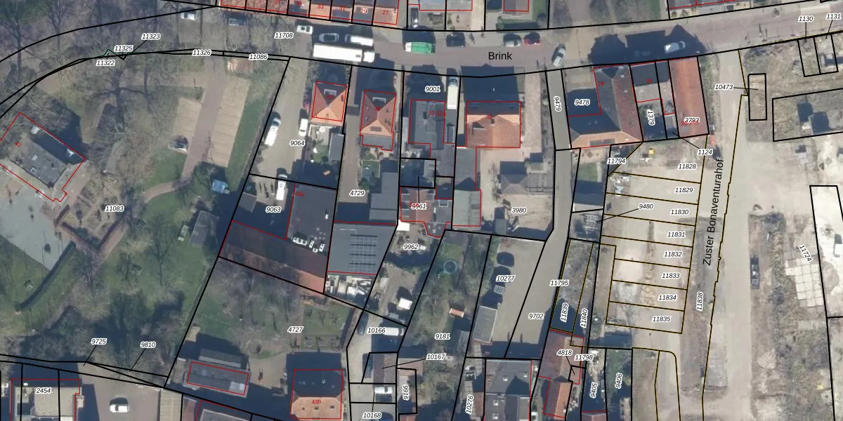 Het perceel waarop Brink 32-a staat heeft een oppervlakte van 382 m². Dit is een groot perceel. De perceeloppervlakte wordt geregistreerd door het Kadaster. Gedetailleerde informatie over de maten van dit perceel kunt u vinden in het rapport Kadastrale kaart met maatvoering van Brink 32-a.