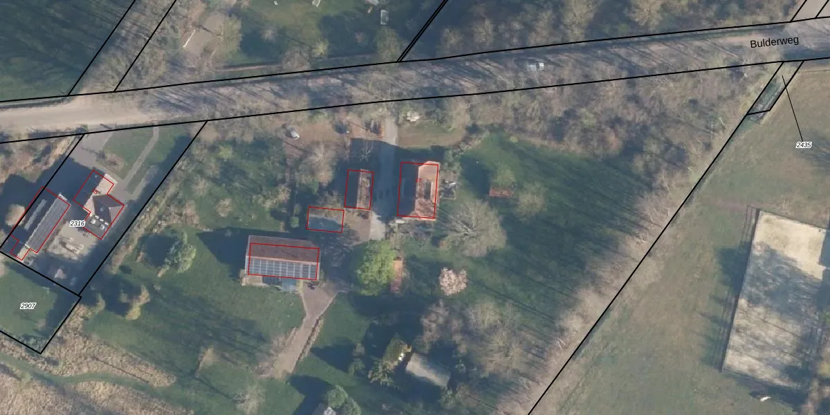 Het perceel waarop Bulderweg 17 staat heeft een oppervlakte van 2,0 ha. Dit is een zeer groot perceel. De perceeloppervlakte wordt geregistreerd door het Kadaster. Gedetailleerde informatie over de maten van dit perceel kunt u vinden in het rapport Kadastrale kaart met maatvoering van Bulderweg 17.
