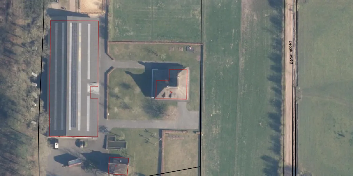 Het perceel waarop Drostenweg 4-a staat heeft een oppervlakte van 2,0 ha. Dit is een zeer groot perceel. De perceeloppervlakte wordt geregistreerd door het Kadaster. Gedetailleerde informatie over de maten van dit perceel kunt u vinden in het rapport Kadastrale kaart met maatvoering van Drostenweg 4-a.