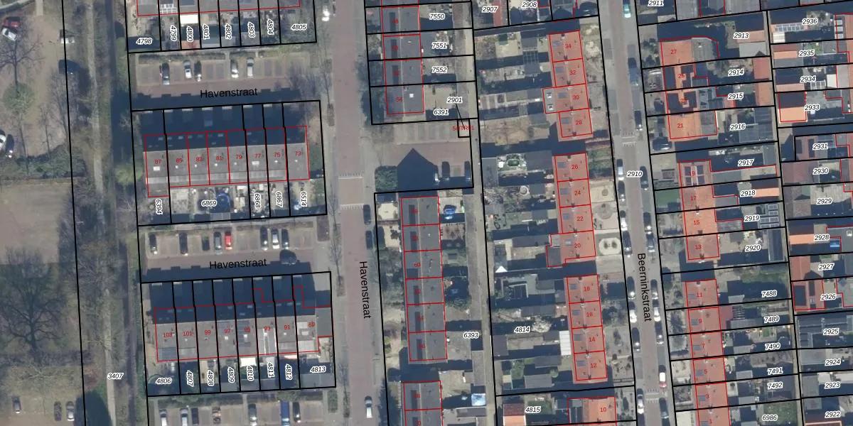 Het perceel waarop Havenstraat 56 staat heeft een oppervlakte van 2185 m². Dit is een zeer groot perceel. De perceeloppervlakte wordt geregistreerd door het Kadaster. Gedetailleerde informatie over de maten van dit perceel kunt u vinden in het rapport Kadastrale kaart met maatvoering van Havenstraat 56.