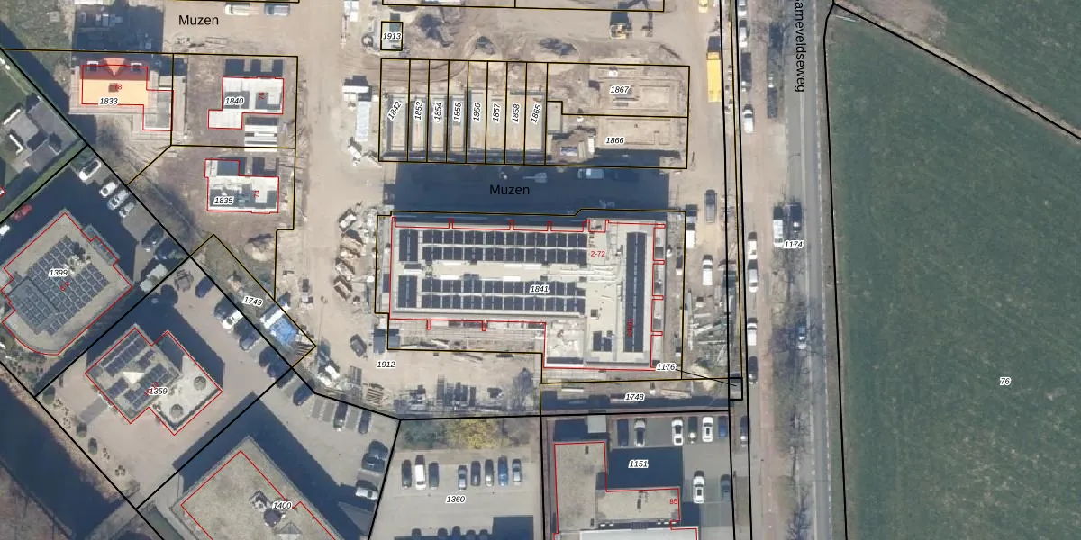 Het perceel waarop Muzen 18 staat heeft een oppervlakte van 1585 m². Dit is een zeer groot perceel. De perceeloppervlakte wordt geregistreerd door het Kadaster. Gedetailleerde informatie over de maten van dit perceel kunt u vinden in het rapport Kadastrale kaart met maatvoering van Muzen 18.