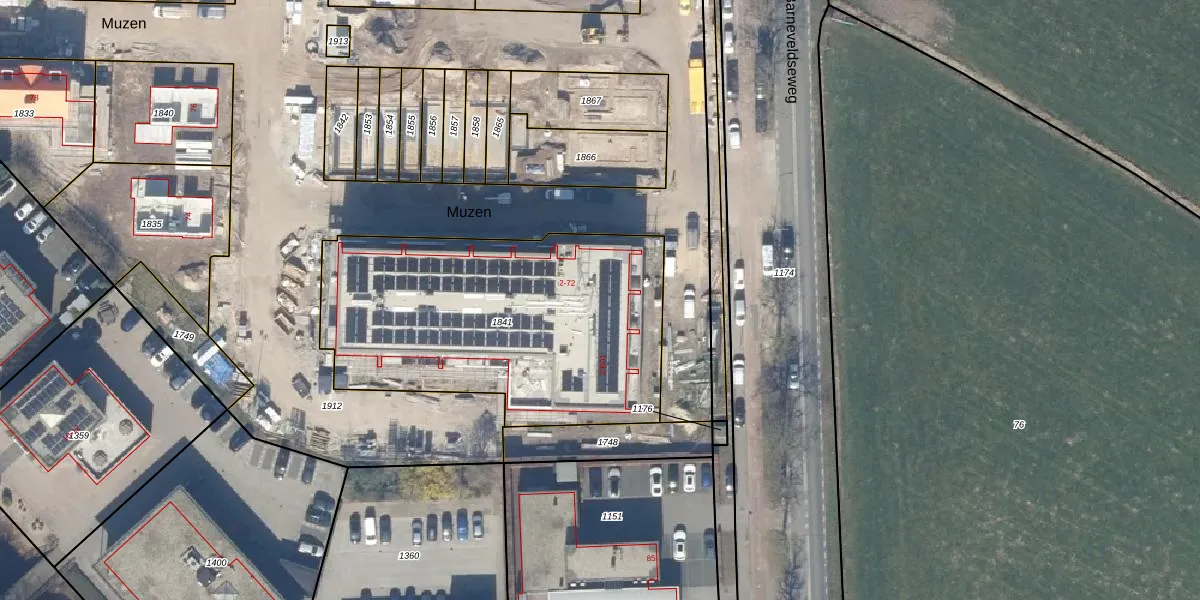 Het perceel waarop Muzen 22 staat heeft een oppervlakte van 1585 m². Dit is een zeer groot perceel. De perceeloppervlakte wordt geregistreerd door het Kadaster. Gedetailleerde informatie over de maten van dit perceel kunt u vinden in het rapport Kadastrale kaart met maatvoering van Muzen 22.