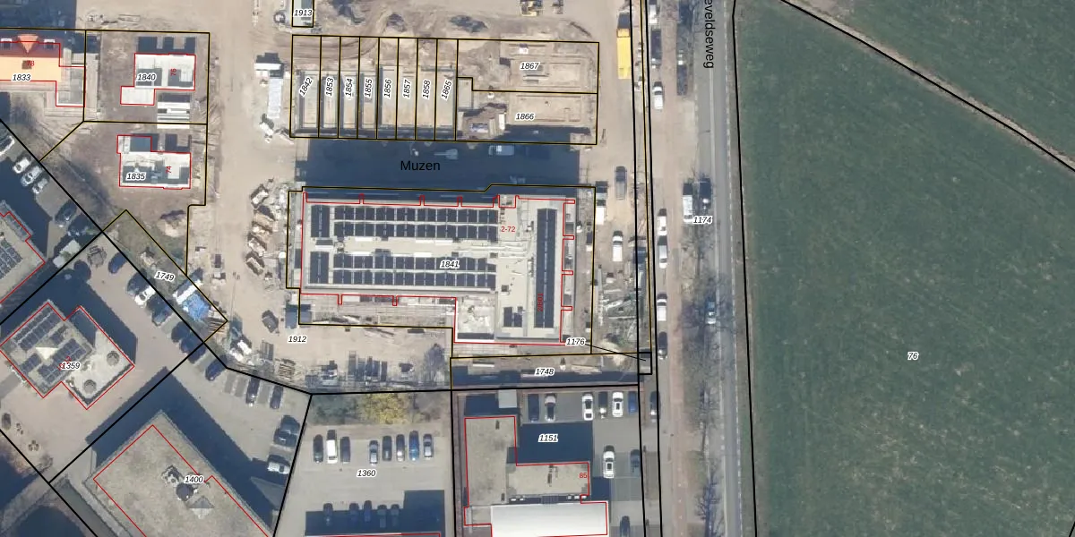 Het perceel waarop Muzen 24 staat heeft een oppervlakte van 1585 m². Dit is een zeer groot perceel. De perceeloppervlakte wordt geregistreerd door het Kadaster. Gedetailleerde informatie over de maten van dit perceel kunt u vinden in het rapport Kadastrale kaart met maatvoering van Muzen 24.