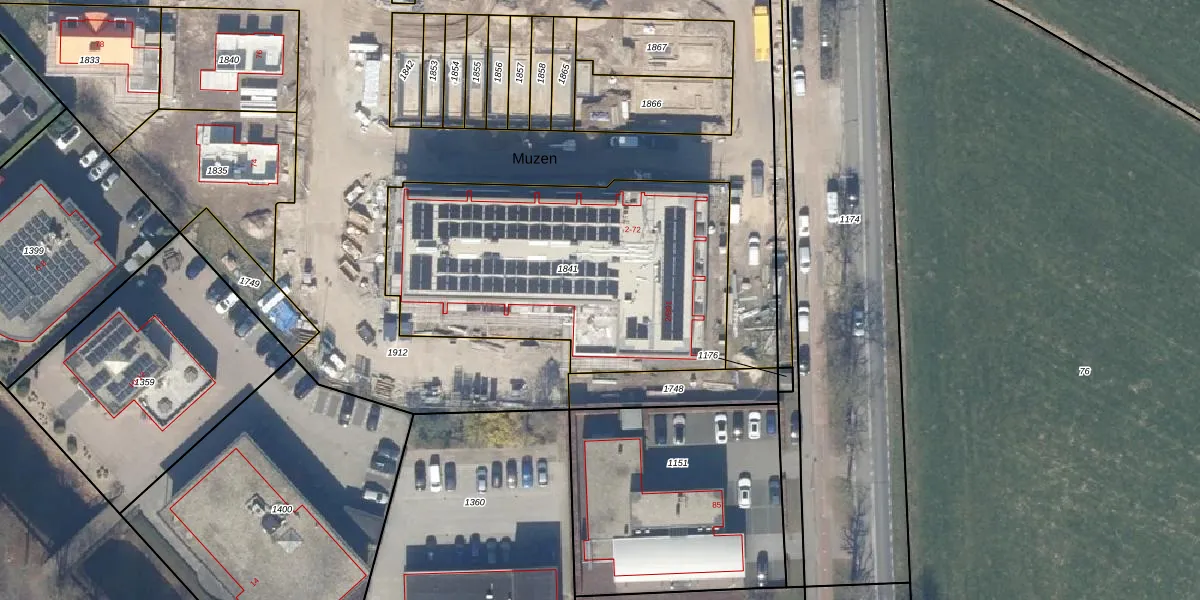 Het perceel waarop Muzen 30 staat heeft een oppervlakte van 1585 m². Dit is een zeer groot perceel. De perceeloppervlakte wordt geregistreerd door het Kadaster. Gedetailleerde informatie over de maten van dit perceel kunt u vinden in het rapport Kadastrale kaart met maatvoering van Muzen 30.