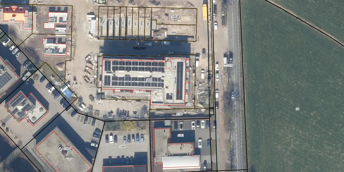 Het perceel waarop Muzen 52 staat heeft een oppervlakte van 1585 m². Dit is een zeer groot perceel. De perceeloppervlakte wordt geregistreerd door het Kadaster. Gedetailleerde informatie over de maten van dit perceel kunt u vinden in het rapport Kadastrale kaart met maatvoering van Muzen 52.