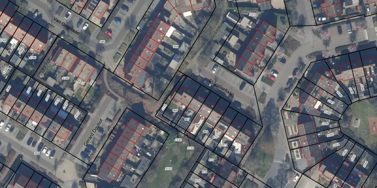 Het perceel waarop Ruysdaellaan 63 staat heeft een oppervlakte van 228 m². Dit is een middelgroot perceel. De perceeloppervlakte wordt geregistreerd door het Kadaster. Gedetailleerde informatie over de maten van dit perceel kunt u vinden in het rapport Kadastrale kaart met maatvoering van Ruysdaellaan 63.
