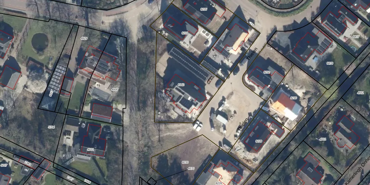 Het perceel waarop Thielen 8 staat heeft een oppervlakte van 1147 m². Dit is een zeer groot perceel. De perceeloppervlakte wordt geregistreerd door het Kadaster. Gedetailleerde informatie over de maten van dit perceel kunt u vinden in het rapport Kadastrale kaart met maatvoering van Thielen 8.