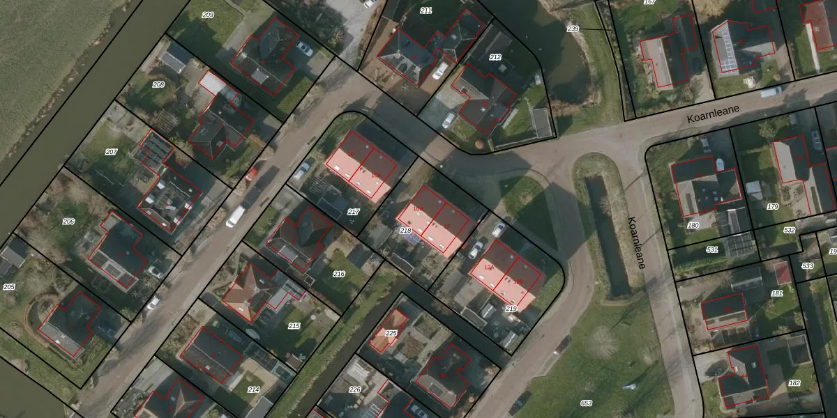 Koarnleane 10-B is gelegen op kadastraal perceel NLD01K218. Deze kadastrale aanduiding is uniek en wordt gebruikt door het Kadaster om eigendomsrechten en andere zakelijke rechten vast te leggen. Het perceel maakt onderdeel uit van de kadastrale gemeente Nieuwland Friesland.