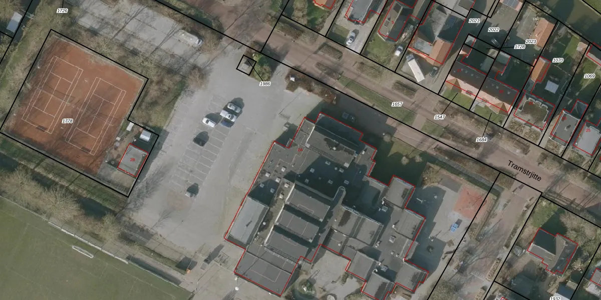 Het perceel waarop Tramstrjitte 2-A staat heeft een oppervlakte van 3,1 ha. Dit is een zeer groot perceel. De perceeloppervlakte wordt geregistreerd door het Kadaster. Gedetailleerde informatie over de maten van dit perceel kunt u vinden in het rapport Kadastrale kaart met maatvoering van Tramstrjitte 2-A.