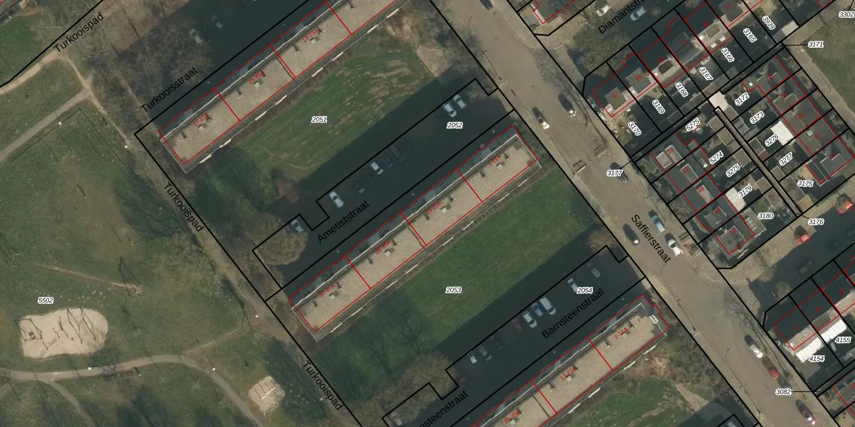 Het perceel waarop Ametiststraat 13 staat heeft een oppervlakte van 2955 m². Dit is een zeer groot perceel. De perceeloppervlakte wordt geregistreerd door het Kadaster. Gedetailleerde informatie over de maten van dit perceel kunt u vinden in het rapport Kadastrale kaart met maatvoering van Ametiststraat 13.