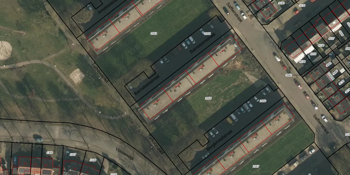 Het perceel waarop Barnsteenstraat 35 staat heeft een oppervlakte van 2955 m². Dit is een zeer groot perceel. De perceeloppervlakte wordt geregistreerd door het Kadaster. Gedetailleerde informatie over de maten van dit perceel kunt u vinden in het rapport Kadastrale kaart met maatvoering van Barnsteenstraat 35.