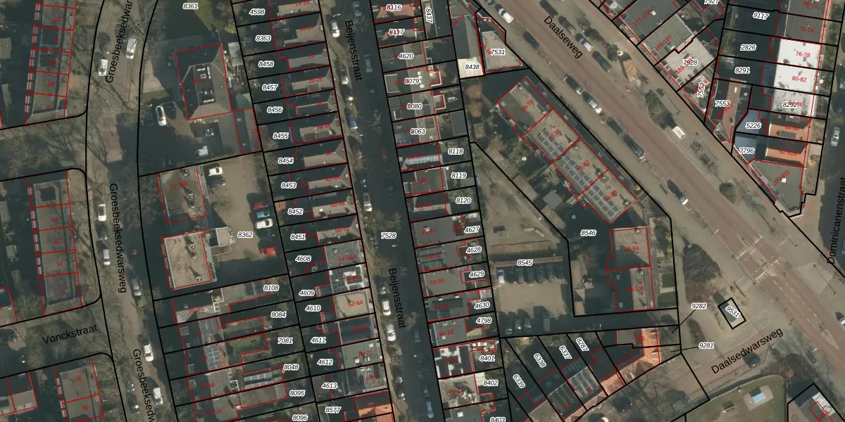 Het perceel waarop het adres ligt is HTT02-A-8120. De afkorting 'HTT02' staat voor kadastrale gemeente Hatert. Het perceel is kleiner dan gemiddeld in Hatert. Het perceel is 101 m² groot, terwijl het gemiddelde ligt op 909,08 m². Het grootste perceel in de kadastrale gemeente is 66,9 ha. Het kleinste perceel heeft een oppervlakte van 0 m². Op het perceel zijn 2 adressen aanwezig. De laatste wijziging in het de Basisregistratie Kadaster (BRK) was op 23-07-2002.