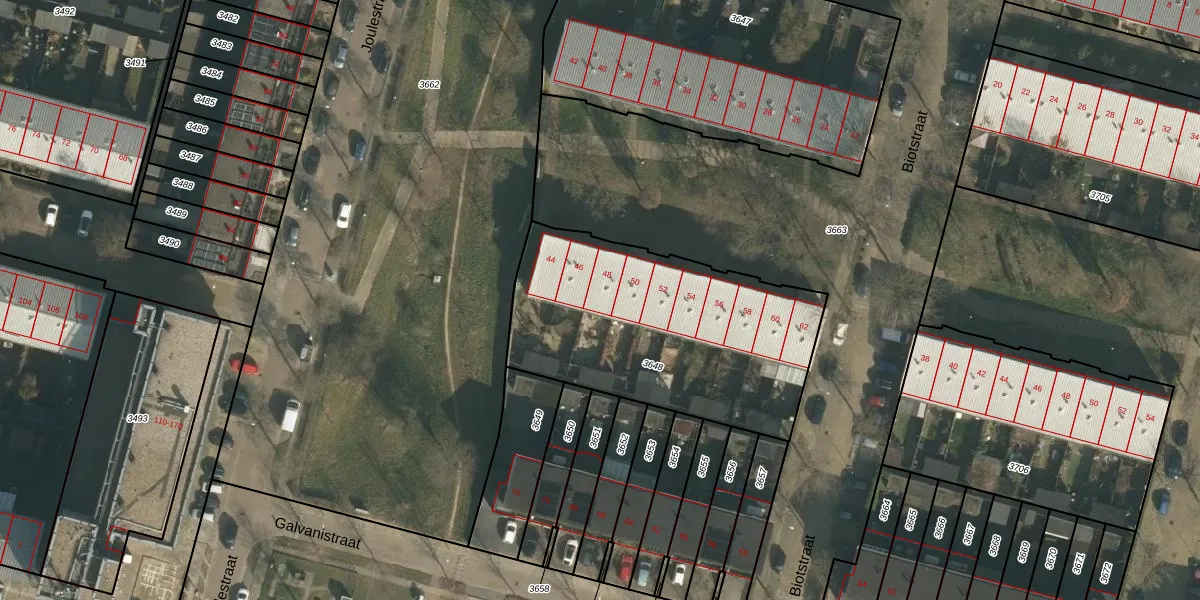 Het perceel waarop Biotstraat 48 staat heeft een oppervlakte van 1265 m². Dit is een zeer groot perceel. De perceeloppervlakte wordt geregistreerd door het Kadaster. Gedetailleerde informatie over de maten van dit perceel kunt u vinden in het rapport Kadastrale kaart met maatvoering van Biotstraat 48.