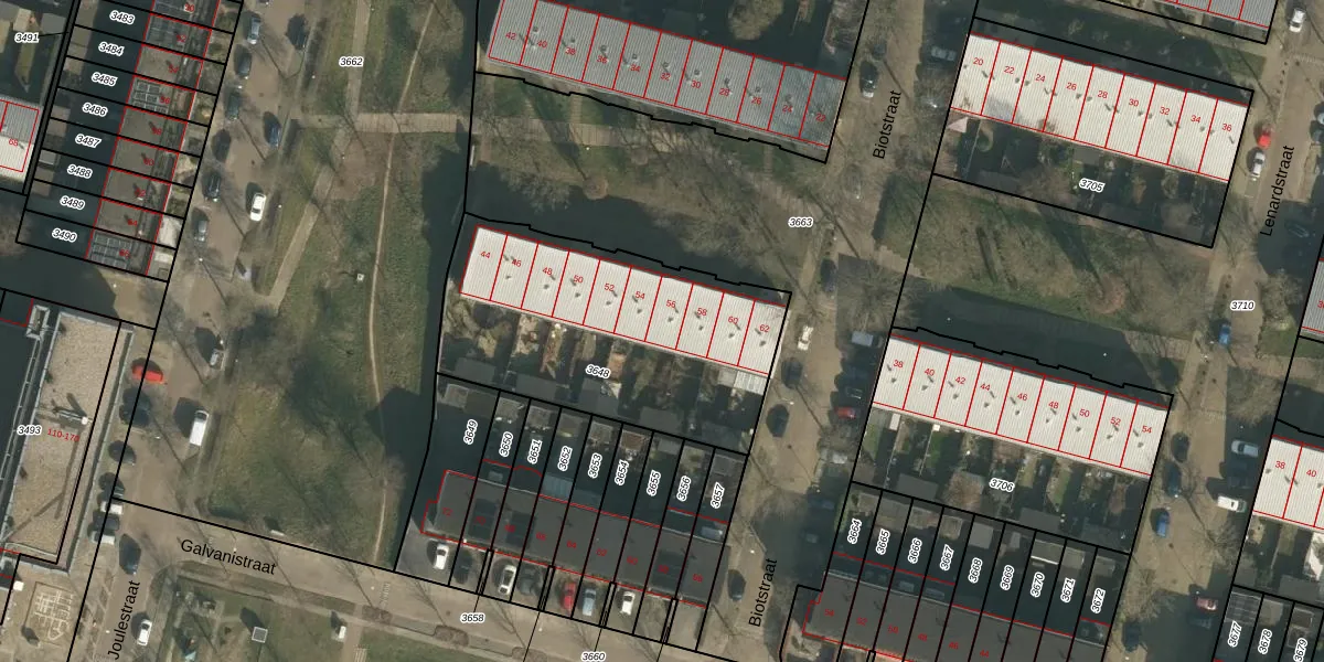Het perceel waarop Biotstraat 56 staat heeft een oppervlakte van 1265 m². Dit is een zeer groot perceel. De perceeloppervlakte wordt geregistreerd door het Kadaster. Gedetailleerde informatie over de maten van dit perceel kunt u vinden in het rapport Kadastrale kaart met maatvoering van Biotstraat 56.
