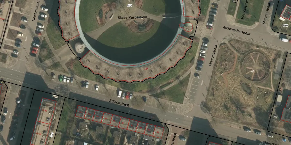 Het perceel waarop Blaise Pascalplein 28 staat heeft een oppervlakte van 7437 m². Dit is een zeer groot perceel. De perceeloppervlakte wordt geregistreerd door het Kadaster. Gedetailleerde informatie over de maten van dit perceel kunt u vinden in het rapport Kadastrale kaart met maatvoering van Blaise Pascalplein 28.