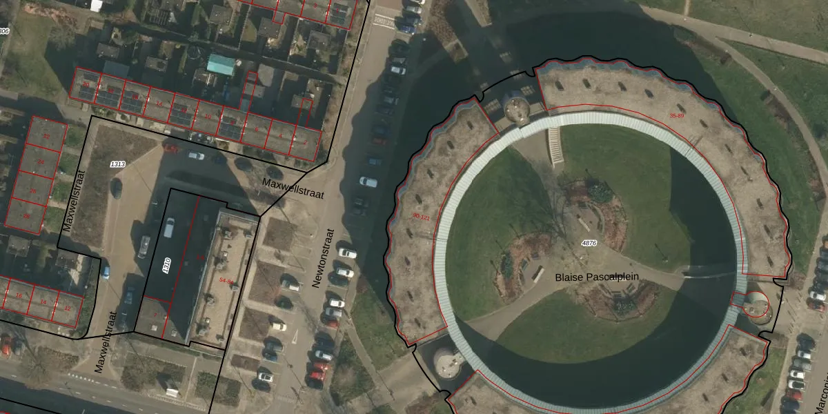 Het perceel waarop Blaise Pascalplein 91 staat heeft een oppervlakte van 7437 m². Dit is een zeer groot perceel. De perceeloppervlakte wordt geregistreerd door het Kadaster. Gedetailleerde informatie over de maten van dit perceel kunt u vinden in het rapport Kadastrale kaart met maatvoering van Blaise Pascalplein 91.