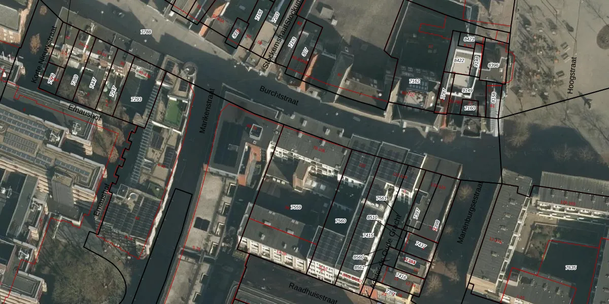 Het perceel waarop Burchtstraat 90 staat heeft een oppervlakte van 1043 m². Dit is een zeer groot perceel. De perceeloppervlakte wordt geregistreerd door het Kadaster. Gedetailleerde informatie over de maten van dit perceel kunt u vinden in het rapport Kadastrale kaart met maatvoering van Burchtstraat 90.