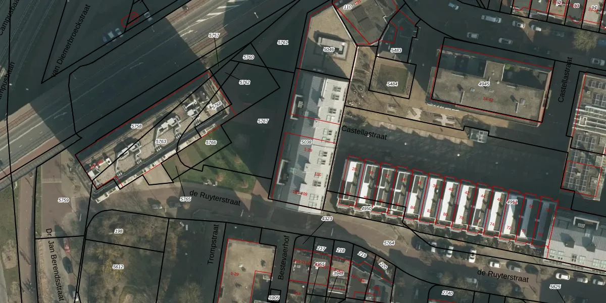 Het perceel waarop Castellastraat 2 staat heeft een oppervlakte van 814 m². Dit is een groot perceel. De perceeloppervlakte wordt geregistreerd door het Kadaster. Gedetailleerde informatie over de maten van dit perceel kunt u vinden in het rapport Kadastrale kaart met maatvoering van Castellastraat 2.