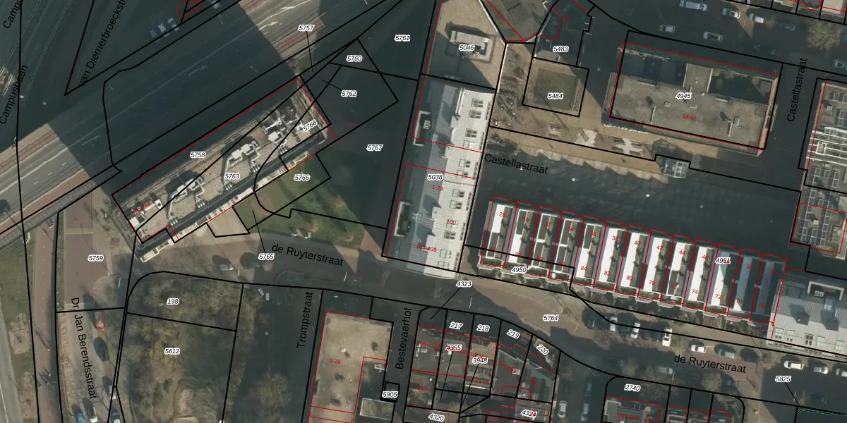 Het perceel waarop Castellastraat 5 staat heeft een oppervlakte van 814 m². Dit is een groot perceel. De perceeloppervlakte wordt geregistreerd door het Kadaster. Gedetailleerde informatie over de maten van dit perceel kunt u vinden in het rapport Kadastrale kaart met maatvoering van Castellastraat 5.