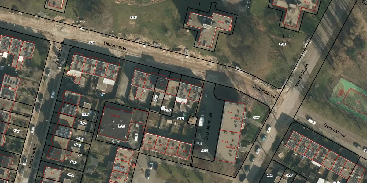 Het perceel waarop Daltonstraat 19 staat heeft een oppervlakte van 7678 m². Dit is een zeer groot perceel. De perceeloppervlakte wordt geregistreerd door het Kadaster. Gedetailleerde informatie over de maten van dit perceel kunt u vinden in het rapport Kadastrale kaart met maatvoering van Daltonstraat 19.