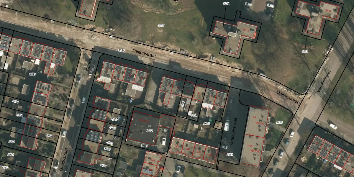 Het perceel waarop Daltonstraat 25 staat heeft een oppervlakte van 7678 m². Dit is een zeer groot perceel. De perceeloppervlakte wordt geregistreerd door het Kadaster. Gedetailleerde informatie over de maten van dit perceel kunt u vinden in het rapport Kadastrale kaart met maatvoering van Daltonstraat 25.