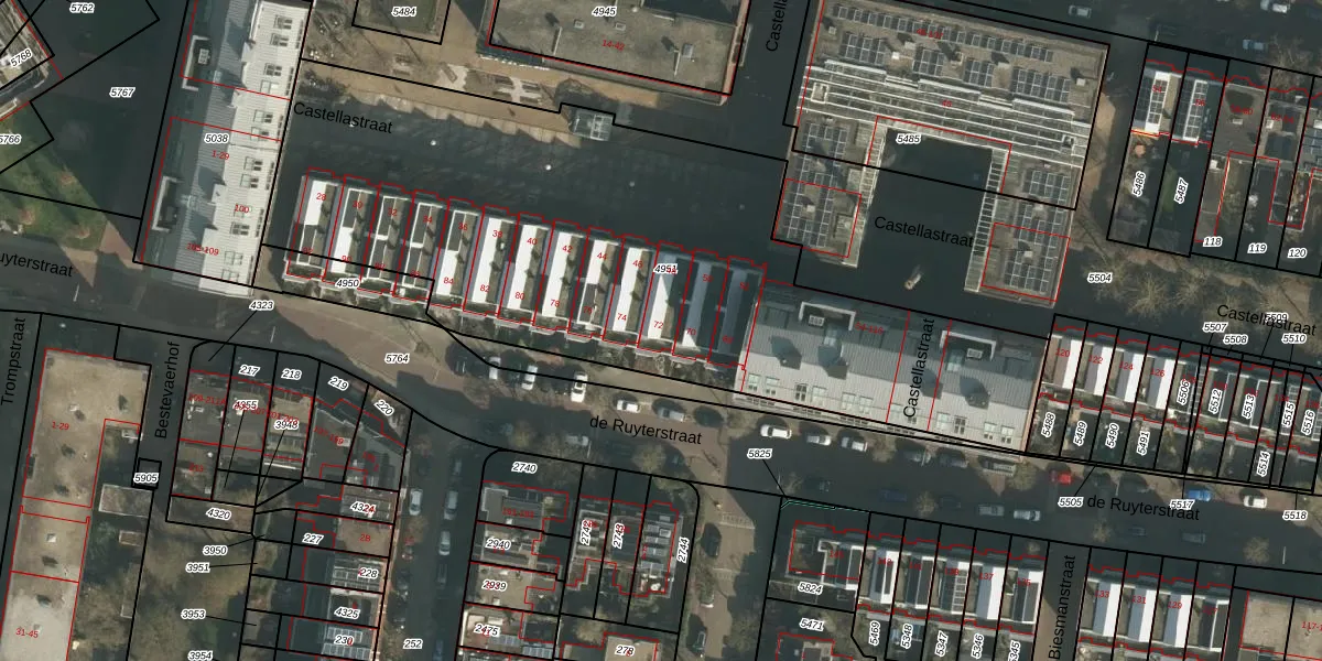 Het perceel waarop de Ruyterstraat 72 staat heeft een oppervlakte van 3263 m². Dit is een zeer groot perceel. De perceeloppervlakte wordt geregistreerd door het Kadaster. Gedetailleerde informatie over de maten van dit perceel kunt u vinden in het rapport Kadastrale kaart met maatvoering van de Ruyterstraat 72.