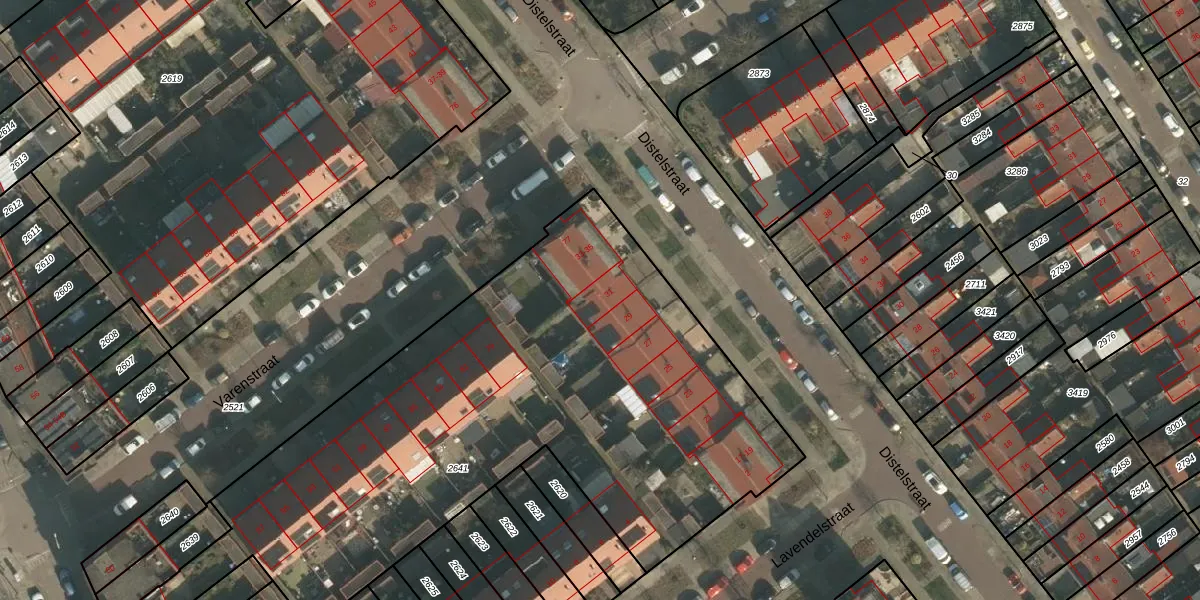 Het perceel waarop Distelstraat 31 staat heeft een oppervlakte van 3566 m². Dit is een zeer groot perceel. De perceeloppervlakte wordt geregistreerd door het Kadaster. Gedetailleerde informatie over de maten van dit perceel kunt u vinden in het rapport Kadastrale kaart met maatvoering van Distelstraat 31.