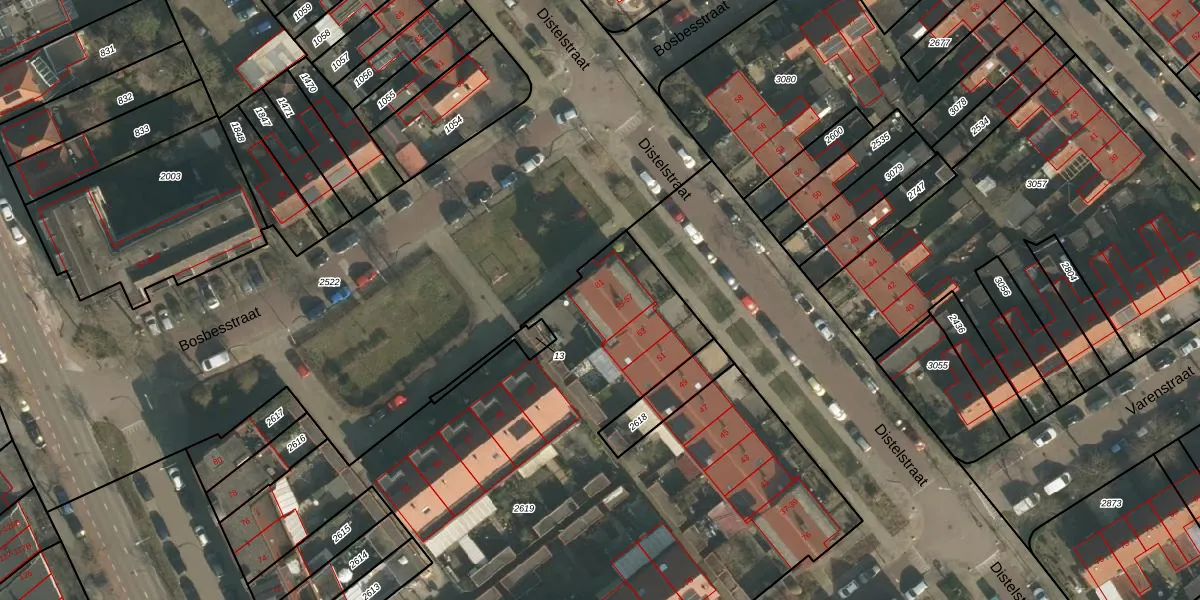Het perceel waarop Distelstraat 55 staat heeft een oppervlakte van 4231 m². Dit is een zeer groot perceel. De perceeloppervlakte wordt geregistreerd door het Kadaster. Gedetailleerde informatie over de maten van dit perceel kunt u vinden in het rapport Kadastrale kaart met maatvoering van Distelstraat 55.