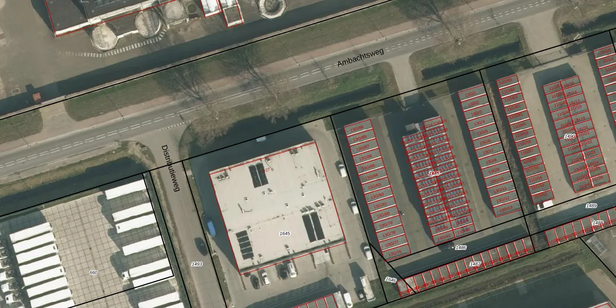 Distributieweg 13 is gelegen op kadastraal perceel NBH00G1645. Deze kadastrale aanduiding is uniek en wordt gebruikt door het Kadaster om eigendomsrechten en andere zakelijke rechten vast te leggen. Het perceel maakt onderdeel uit van de kadastrale gemeente Neerbosch.